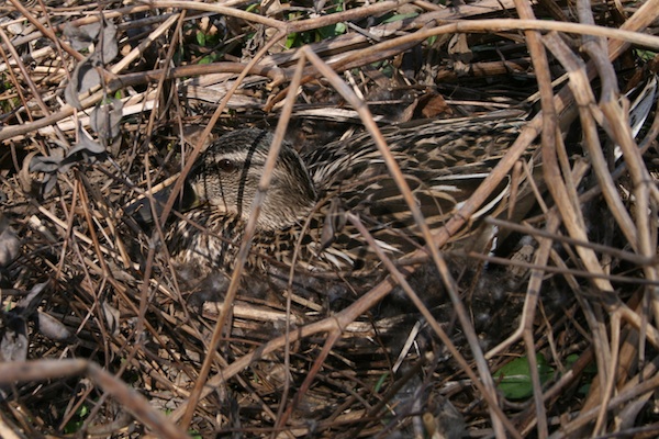 ![]() Around April first, I discovered a duck nest, with eggs, in our prairie garden. While clearing brush from the garden, I had unwittingly removed the dried stalks of false blue indigo (Baptisia australis) that had covered it. I had actually been watching for such a nest, because the same thing happened in 2008, and I didn't really want to repeat my blunder, but the camouflage fooled me. I tried to replace the nest's shelter with a haphazard arrangement of plant stems, and hoped I hadn't done too much damage. I was relieved to see the mother incubating her eggs a few days later, and I've been checking on her for three weeks now. She has been on the nest every time I've checked, usually several times each day. A few days ago I set up a spotting scope on our porch, about 25 yards away, so I could easily check on her more often. It's been a relatively mild spring, but she has nevertheless endured frost, rain and even some pea-sized hail. Day after day, she patiently sits, sometimes repositioning herself, or doing a little preening, or some rearranging of nest material, but never leaving as far I can tell. The incubation period for mallards is about four weeks, so I expect the eggs to hatch later this week. As I understand it, the ducklings typically leave the nest within 24 hours of hatching, so we'll have to be vigilant to avoid missing them. I'll be collecting photos. Update: At around 7:00 the morning after I wrote this item, I found the nest unoccupied. While I was peering into the nest to try to count the mostly-covered eggs (looked like at least four), a pair of mallards flew into the yard. I moved away from the nest, and by the time I was in the house the mother duck was heading over to the nest. So she actually does leave sometimes, meeting up with the presumed father. Update 2: On the morning of 30 April, we saw ducklings at the nest. I managed to get some pictures (through the spotting scope) in which they can just barely be seen. I've added these to our Prairie Garden Duck Nest gallery on smugmug. Posted: Sun - April 25, 2010 at 03:19 PM by email
