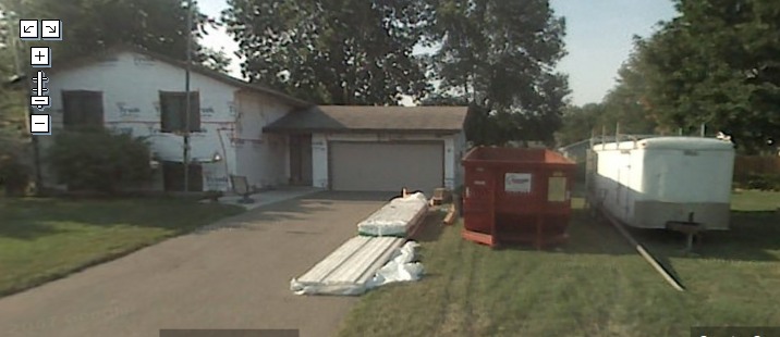 I was surprised to see that they just happened to come down our street in August of last year, while we were having new siding installed! The image below is from their photos, and shows our house wrapped in Tyvek, stacks of materials in the driveway, a big red dumpster, and the contractor's trailer in the yard. I suppose it may be years before Google updates such photos, so if you're using Google Maps to plan a visit, bear in mind that the house doesn't look exactly like that anymore. ![]() Posted: Sat - February 16, 2008 at 05:32 PM by email